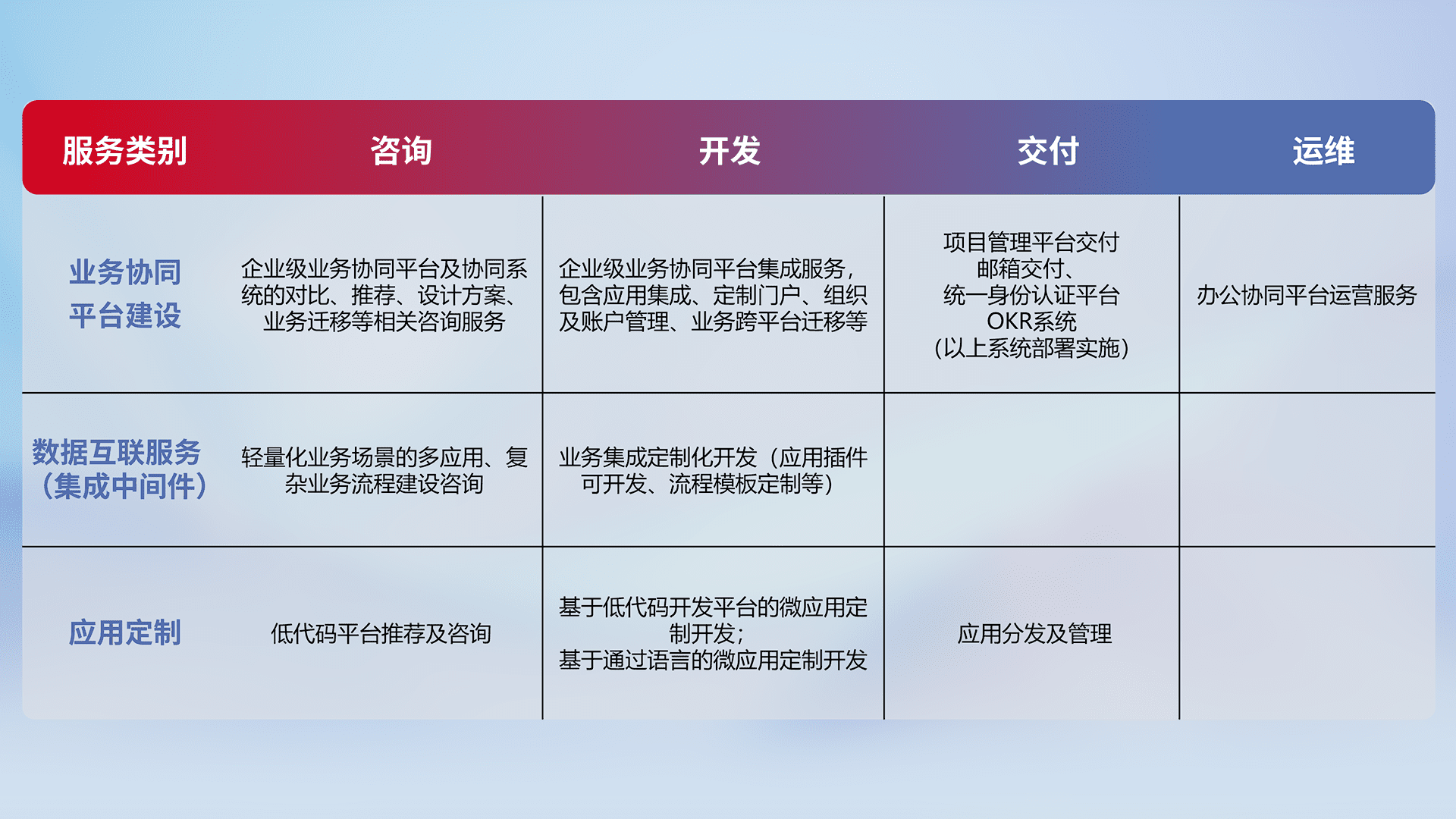 针对钉钉、、、、企微、、、IDaas等平台级产品提供产品的规划、、、、方案、、交付、、、、定制化开发等服务,,实现如统一协同办公、、、智能客户服务、、混合会议管理、、、、智能数据查询、、、、等业务场景,,,实现数字化转型。。。